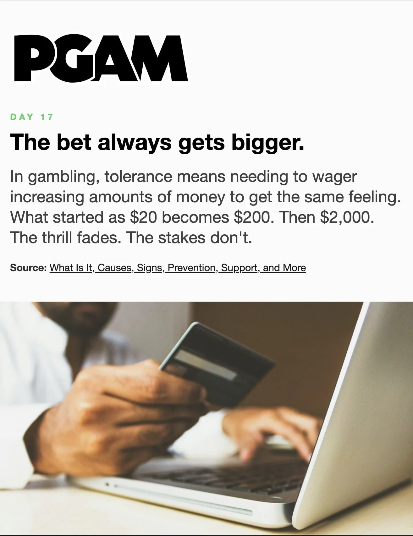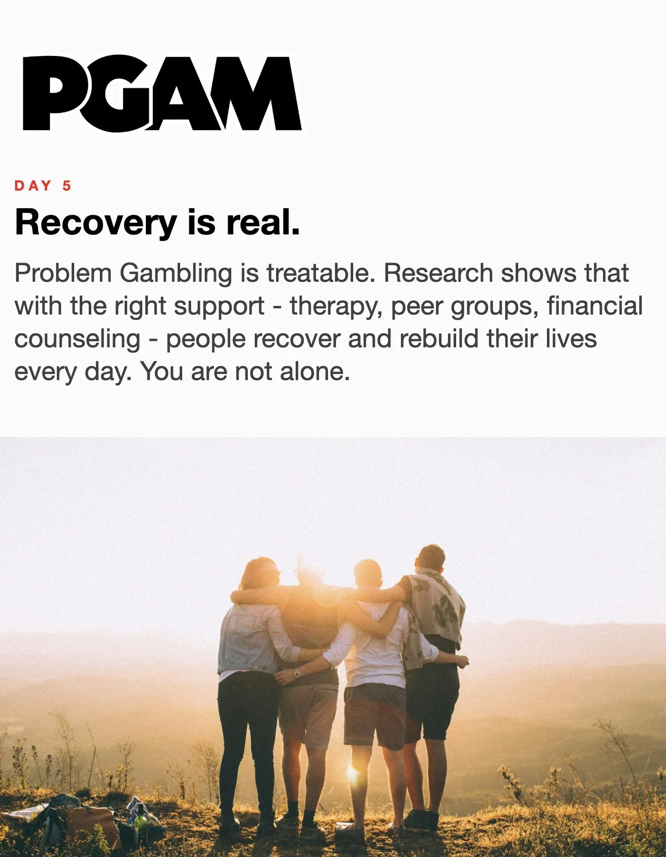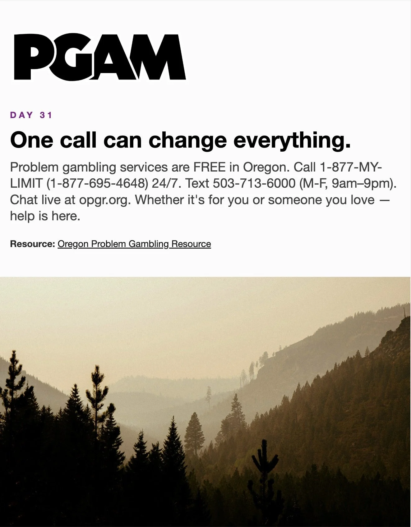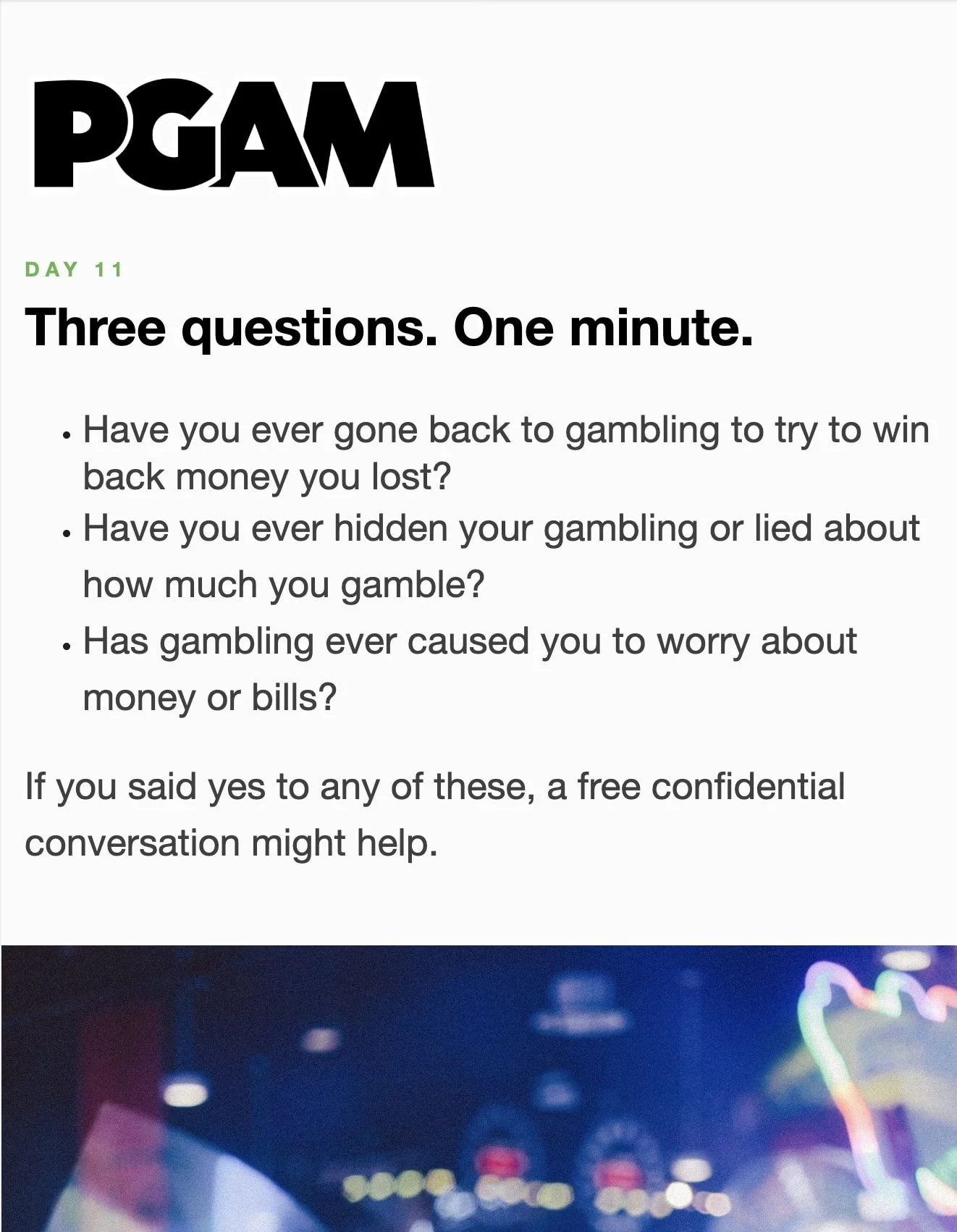 March is Problem Gambling Awareness Month Each day during March, receive a short Email or Text Message with compelling facts and useful skills. Sign up below… * indicates required Email Address * Get the Emails * indicates required SMS Phone Number * PGAM – By providing your phone number and checking the box, you agree to receive SMS communications from PGAM. Message and data rates may apply. Text HELP for help. Text STOP to cancel. See Terms and Privacy Policy. Get the Texts MarchLetters 1st 2nd 3rd 4th 5th 6th 7th 8th 9th 10th 11th 12th 13th 14th 15th 16th 17th 18th 19th 20th 21st 22nd 23rd 24th 25th 26th 27th 28th 29th 30th 31st